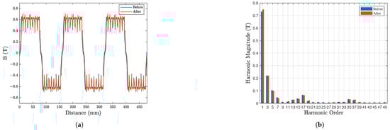 The PM width expands from 50.00 mm to 52.90 mm, effectively increasing the effective pole-arc coefficient. This adjustment may improve the spatial distribution of the air gap flux density, reducing harmonic distortion. As shown in Figure 14b, a notable suppression of the 5th, 7th and 17th harmonics can be seen. The total harmonic distortion (THD) of the air gap flux density decreases from 37.67% to 35.37%. This change is likely to reduce iron losses to counter the potential increase in permanent magnet eddy current losses due to increased to maintain at a high level. Smoother flux distribution probably contributes to the 10.48% reduction in . The expanded also enhances flux linkage, synergizing with and to elevate .
