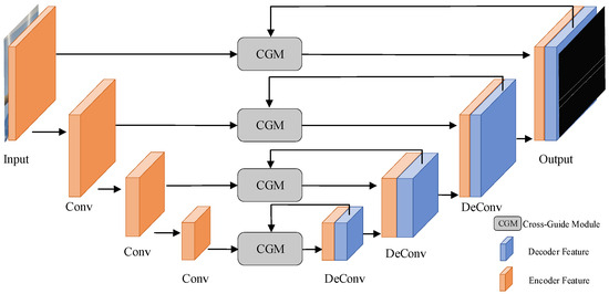 Figure 2 shows a schematic of the CGM. The features extracted by the encoder are connected through crosslayers. Initially, channel attention is extracted, followed by the calculation of spatial attention. The calculated spatial attention utilized to weigh the decoder features guides the decoder’s image recovery process. Furthermore, the features extracted by the decoder undergo the same operation, and the cross-weighted features are concatenated to generate edge images.