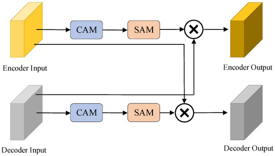 Equation (2) is used to calculate the weighted attention of the decoder. is the feature attention weight of the encoder, and is the input feature of the decoder. Similarly to Equation (1), point multiplication is performed to obtain the output feature of the decoder.