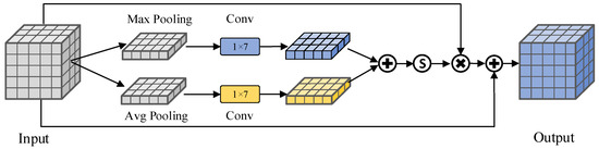 is the input feature map. represents applying max pooling operation to the input feature map, and represents applying the average pooling operation to the input feature map. represents convolution operation, and is the Sigmoid activation function. is the calculated attention weight. Equation (4) multiplies with point and performs residual connections to obtain the output, .