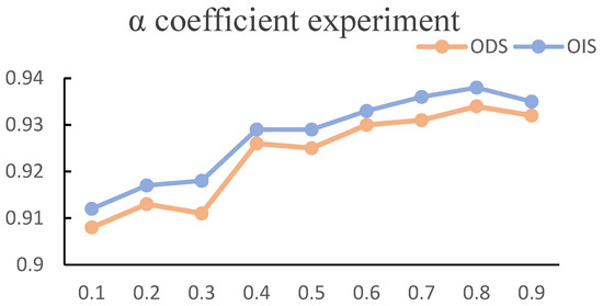 As shown in the above figure, when the value of α was small, the penalty effect of the loss function was not good, resulting in lower ODS and OIS. When the value was 0.9, the optimization space given to the model was relatively small, and the effect was not as good that at 0.8. Therefore, this study selected 0.8 as the value of α.