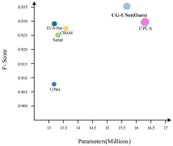 Figure 6 illustrates the experimental results of replacing our proposed attention module with other algorithms. Senet calculates channel attention through the fully connected layer. CBAM adds spatial attention based on Senet, resulting in a 0.2% increase in the F-score. ECA-Net substitutes the calculation of channel attention with efficient convolution operations, enhancing the model’s edge detection capabilities while reducing the number of parameters. CPCA enhances the model’s attention to spatial content by separately extracting spatial attention from features weighted by channel attention. The attention module proposed in this study, which is based on ECA-Net and incorporates the advantages of the above attention modules, achieved the most favorable recognition results, with the F-score reaching 0.934. Moreover, the parameters of CG-UNet were superior to those of CPCA, being reduced by 0.7 M.