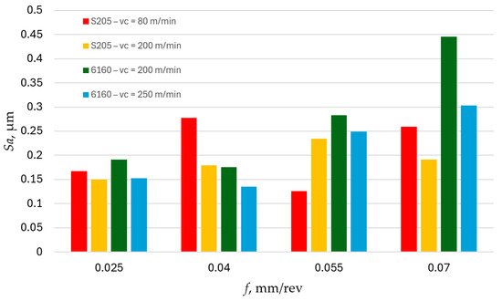 Comparing the obtained Sa parameter values after turning with S205 carbide tools and 6160 ceramic tools at the same cutting speed vc = 200 m/min, it can be observed that the S205 carbide tools produce surfaces with lower Sa roughness parameter values (Figure 1). This is particularly evident for the highest applied feed rate of f = 0.07 mm/rev, where the Sa parameter obtained with the ceramic 6160 tool is more than twice as high compared to the value achieved with the S205 carbide tool. The reduction of the Sa parameter was obtained by Suarez et al. [30] by using ultrasonic assisted machining. Compared to conventional machining, the Sa parameter was three times smaller.