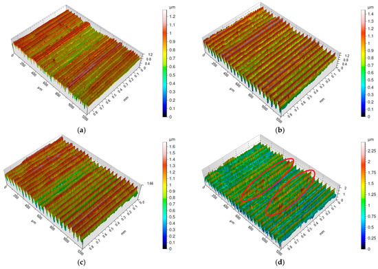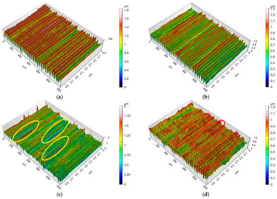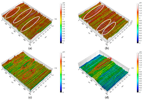 Figure 2, Figure 3, Figure 4 and Figure 5 present isometric maps of the machined surfaces. Characteristic turning marks were observed on all analyzed surfaces. The surfaces obtained with a feed rate of f = 0.025 mm/rev exhibit similar Sa parameter values, but their isometric images differ (Figure 2a–d). High ridges were observed on surfaces machined with both S205 and 6160 tools. The difference between these surfaces is that on the S205-machined surfaces, distinct areas of high ridges can be identified (marked on figures by red circle), whereas on the 6160-machined surfaces, individual ridges appear sporadically (marked on figures by white circle). Additionally, on the surface machined at a cutting speed of vc = 200 m/min (Figure 2c), a higher frequency of high ridges was observed compared to the surface machined at vc = 250 m/min (Figure 2d).