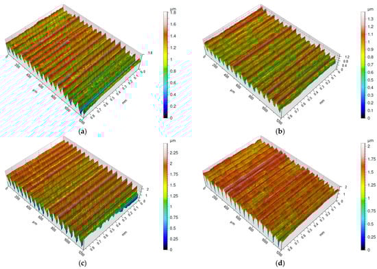 The isometric maps of surfaces machined with a feed rate of f = 0.07 mm/rev show that neither the surfaces machined with S205 inserts nor those machined with 6160 inserts exhibit individual high peaks (Figure 5a–d). The distances between adjacent ridges are evenly distributed. Among the four surfaces, the one machined with the 6160 insert stands out with narrower valleys, making it appear flatter (Figure 5d). A surface with this characteristic is more resistant to wear. Pawlus et al. [33] defined the Sp/Sz ratio as the coefficient of emptiness, which reached its lowest value for the surface machined with the 6160 insert at f = 0.07 mm/rev.