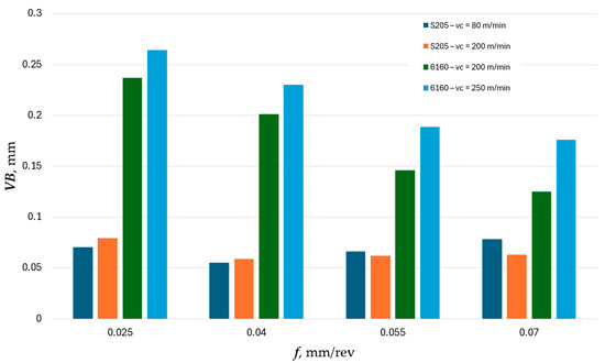 Perez-Salinas et al. [34] demonstrated that cutting edge wear is related to chip vibration frequency. They confirmed that the frequency of chip generation decreases as flank wear increases. Based on Figure 6, it can therefore be inferred that higher chip vibration frequencies are associated with cutting edges made of S205-coated cemented carbides. In the case of these inserts, the flank wear VB did not exceed 0.08 mm for all tested feed rates. Significantly greater wear was recorded on inserts made of 6160 ceramics. Therefore, it can be assumed that machining with ceramic inserts is accompanied by lower chip vibration frequencies.