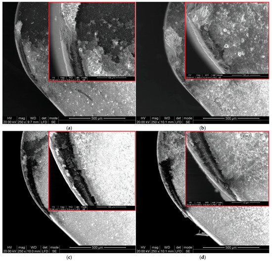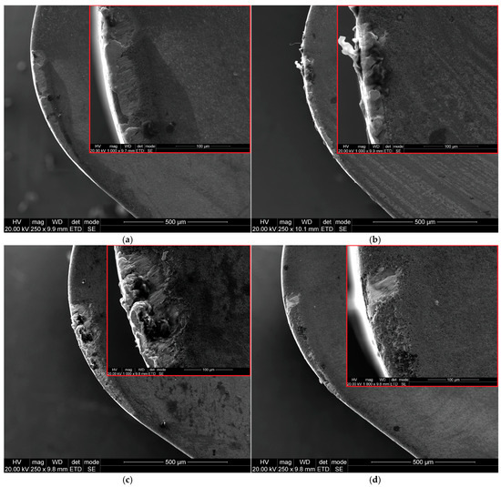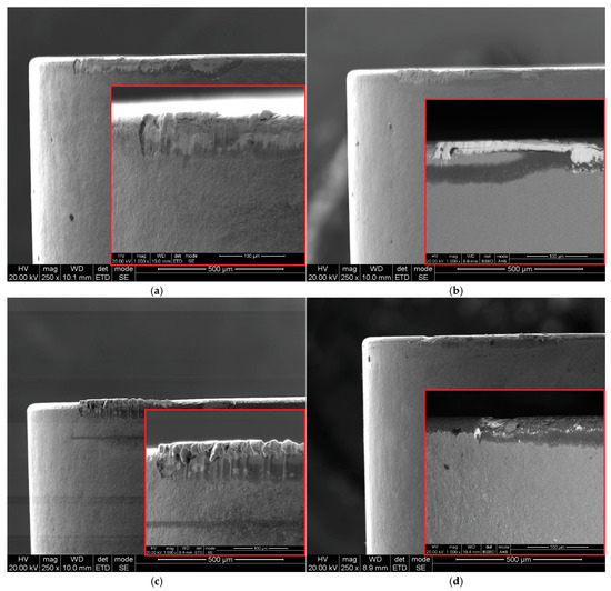 Cutting with a feed of f = 0.07 mm/rev and a cutting speed of vc = 80 m/min favors the formation of a built-up edge on the cutting edge (Figure 7c and Figure 8c). However, machining with the same feed rate but a higher cutting speed of vc = 200 m/min leads to severe coating delamination on the cutting edge (Figure 7d). Khochtali et al. [35] stated that material loss on the rake surface is caused by the detachment of tool fragments along with adhered workpiece material. This phenomenon is intensified by increased coolant pressure. However, Figure 7 demonstrates that the amount of material loss on the cutting edge also depends on cutting parameters such as feed rate and cutting speed.