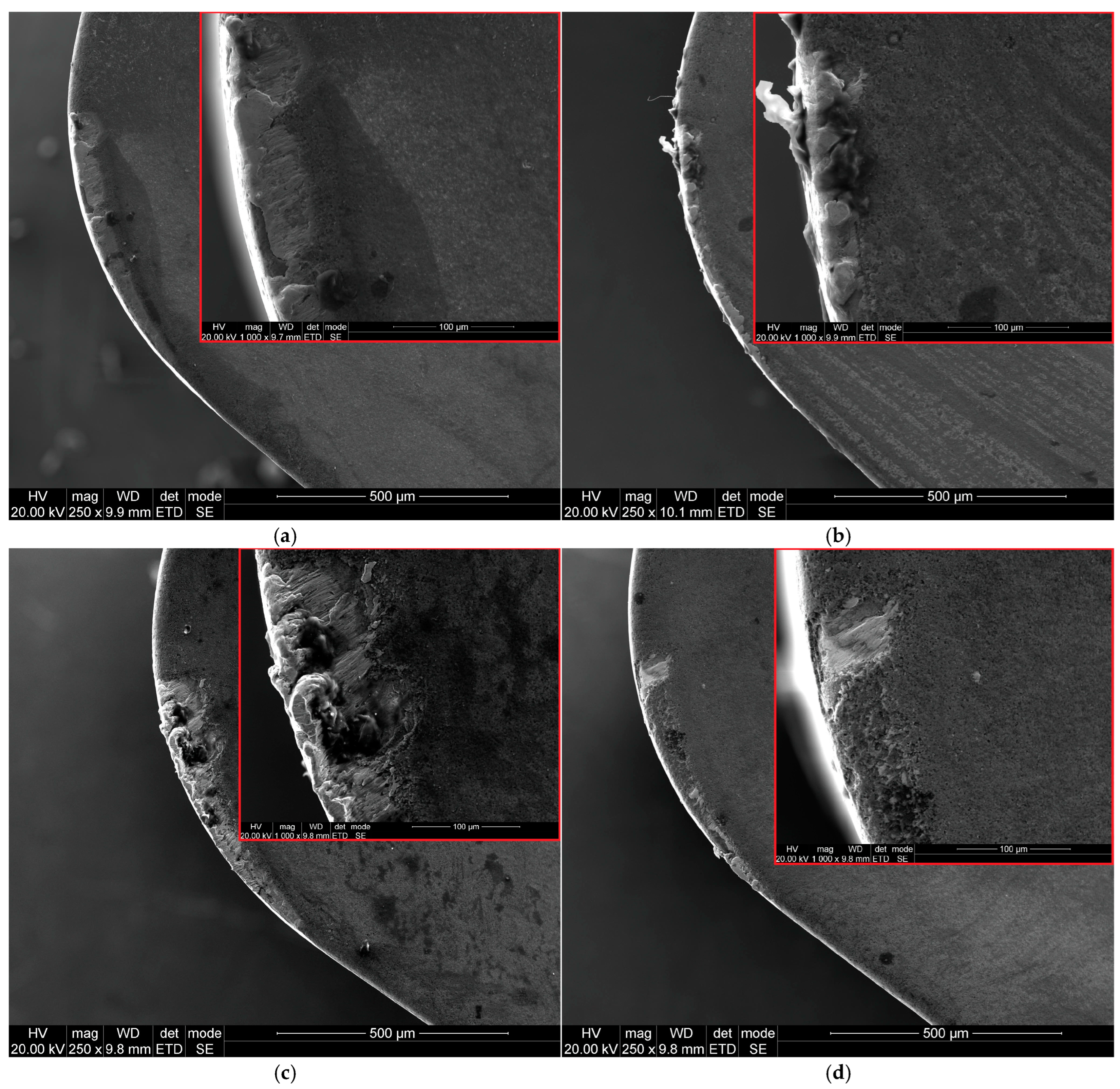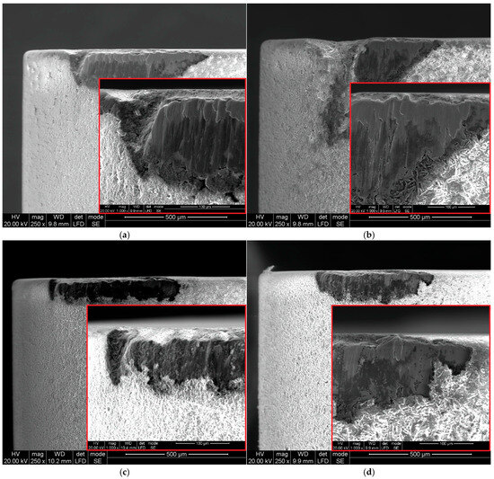 SEM images of flank face of ceramic inserts 6160: (a) vc = 80 m/min, f = 0.025 mm/rev; (b) vc = 200 m/min, f = 0.025 mm/rev; (c) vc = 80 m/min, f = 0.07 mm/rev; (d) vc = 200 m/min, f = 0.07 mm/rev.