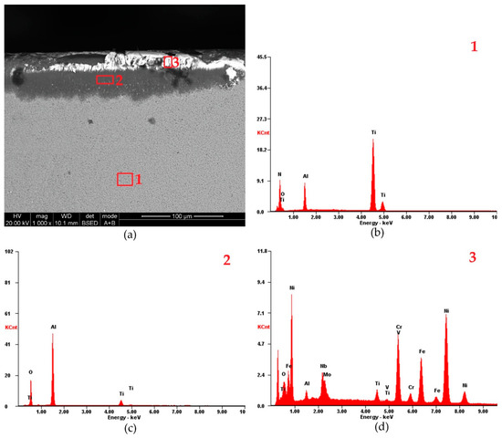 Though trace amounts of Ti remained (Table 2). The removal of the TiN layer exposed the Al2O3 layer, which continued to protect the cutting tool. No elements of the cutting insert substrate (W, C or Co) were found in point 2. EDS analysis at point 3, located on the cutting edge (Figure 11d), confirmed the formation of a built-up edge. Elements such as Ni, Cr, and Fe, key components of Inconel 718, were detected. Additionally, Al and O were found, indicating that the Al2O3 layer was still intact and had not exposed the underlying TiCN layer adjacent to the WC-Co substrate. This suggests that the Al2O3 layer exhibits higher adhesion tendencies compared to the TiN layer, which was completely removed due to abrasive wear.