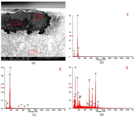 The EDS analysis conducted at point 1 of the 6160 insert reveals similar characteristics to those observed in the S205 insert. Specifically, no elements characteristic of the machined material were detected at this location (Figure 12b). The elements recorded at point 1 were Si, Al, O, and N (Table 3). Point 2 on the 6160 insert was located 40 µm below the cutting edge (Figure 12c). The EDS analysis at this point revealed trace amounts of the machined material (elements Ni, Cr, and Fe) as well as elements characteristic of the cutting insert itself, namely Si, Al, O, and N. This differentiates the 6160 insert from the S205 insert, as no machined material elements were detected in point 2 of the S205 insert. Notably, significant changes in the quantities of Al and Si were observed between points 1 and 2. In point 2, the Al content was 50% lower, while the Si content increased by 132% compared to point 1. At point 3 (Figure 12d), the EDS analysis confirmed a substantial presence of the machined material, with Ni, Cr, and Fe detected in concentrations of 45.04 wt%, 15.32 wt%, and 14.25 wt%, respectively.