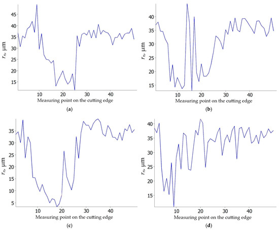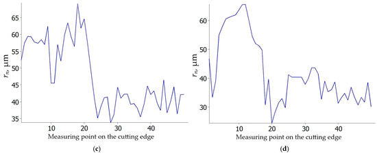 Cutting edge radius rn of S205 carbide insert: (a) vc = 80 m/min, f = 0.025 mm/rev; (b) vc = 200 m/min, f = 0.025 mm/rev; (c) vc = 80 m/min, f = 0.07 mm/rev; (d) vc = 200 m/min, f = 0.07 mm/rev.