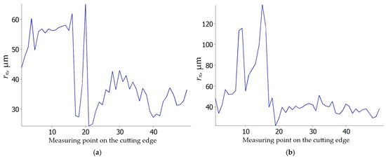 The cutting edge radius of the tools used in the study was measured using a 3D Portable RL optical microscope (Bruker Alicona, Graz, Austria). Measurements were performed in 50 cross-sections, in a left-to-right direction.