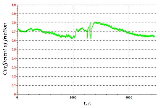 In study [42], the friction coefficient was determined for an AlTiN coating applied to a carbide cutting tool. Researchers found that the coefficient is variable over time and depends on the wear level of the cutting tool, with a maximum value of 0.85. The measured friction coefficient for the S205 insert is shown in Figure 15. It is important to note that the measurement was conducted over 80 min, whereas the tool life of inserts used for machining nickel alloys typically does not exceed 20 min. The obtained friction coefficient for the S205 insert with a TiCN/Al2O3/TiN coating applied via CVD method fluctuates around 0.7, which is approximately 20% lower than the AlTiN-coated insert. Efforts to reduce friction and thus extend tool life are focused on replacing conventional cooling/lubrication methods. One such approach was proposed by Sivalingam et al. [43], who used an atomized spray cutting fluid (ASCF), achieving an almost 40% increase in tool life.