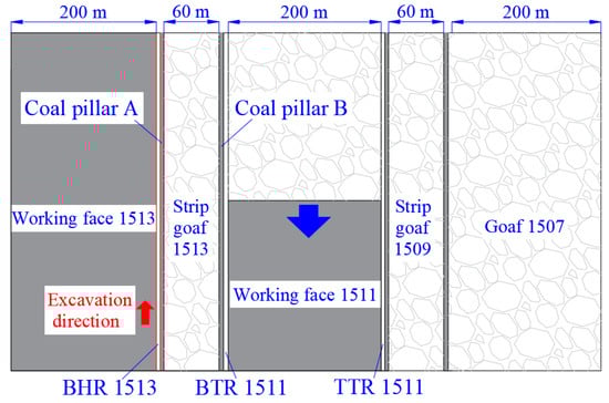 This study investigates the 3up coal seam at the Xinyi Coal Mine (Jining, Shandong, China), with an average working face burial depth of 507 m. To minimize surface subsidence impacts on adjacent villages, the mine adopted alternating wide-narrow working face mining during initial operations (Figure 1). Following the extraction of the 60 m wide strip working face 1513, a 5 m wide coal pillar was preserved along the goaf boundary to facilitate the construction of BHR 1513—a 1008 m fully gob-side roadway serving working face 1513. Concurrently, adjacent working face 1511 (200 m width) underwent active extraction, classifying BHR 1513 as a narrow-pillar gob-side roadway under distant mining conditions.