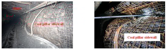 The initiation of the TTR 1511 driving commenced two years subsequent to the conclusion of the strip working face 1509 mining. This driving took place adjacent to the progressing working face 1507. Prior to the commencement of working face 1507 mining, the roof movements within the goaf of the strip working face 1509 had already stabilized, accompanied by a stationary mining-induced stress field surrounding the goaf. As a result, the TTR 1511 was positioned in a comparatively stable stress environment, unaffected by fluctuating stresses. The encounter between the track roadway working face 1511 and the mining working face 1507, spanning from a convergence of 50 m to a staggering distance of 200 m, would induce stress disturbances subsequent to the mining of working face 1507. These disturbances manifested as significant roof inclination and deformation, along with overall displacement of the coal pillar sidewalls within the roadway (Figure 2).