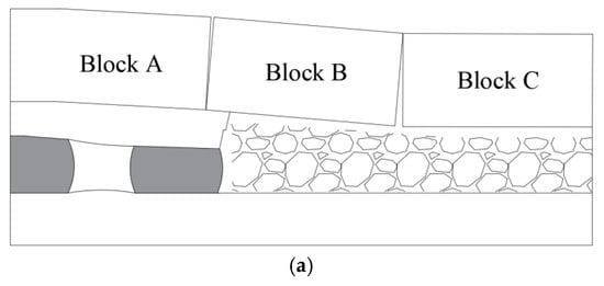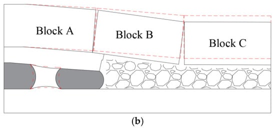 Before mining the working face 1511, only KS1 in the roof overlying strata of the strip goaf 1513 breaks and collapses, while high KS do not break. Therefore, block A and B only need to bear the weight of the strata below the unbroken KS2. The rotation deflection of block A and B at this stage are relatively small as it is related to the weight of the strata that it bears (Figure 3a). After the completion of the mining of the working face 1511, the two goafs connect, causing the high KS in the roof of the overlying strata of the strip goaf 1513 to break. At this time, block A and B further rotate and subside towards the strip goaf 1513 due to increased load-bearing. Due to the rotation and subsidence of block A and B, the roof of the roadway further tilts towards the goaf, and the coal pillar sidewall squeezes into the roadway space (Figure 3b).