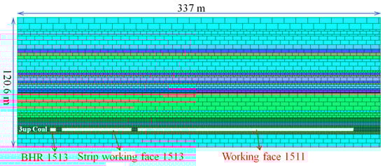 To analyze the pressure transfer mechanism from working face 1511 mining to BHR 1513, a UDEC numerical model (Figure 4) was constructed based on the mine’s geological conditions. The model spans 337 m horizontally and 120.6 m vertically, with BHR 1513 dimensions defined as 4.0 m (width) × 3.4 m (height). Critical components include the following: strip working face 1513 (60 m width), working face 1511 (200 m width), and dual coal pillars A/B (5 m each). The 3up coal seam exhibits a 3.4 m thickness at a 507 m burial depth, positioned 102 m below the model’s upper boundary. A vertical stress gradient of 0.025 MPa/m was implemented, resulting in 10 MPa/m vertical load imposed on the upper boundary. Displacement constraints were applied as follows: vertical fixation at the base, and horizontal fixation at lateral boundaries. Coal seam occurrence characteristics and mechanical parameters (Table 1) were incorporated into the model, with simulations executed using the Mohr–Coulomb yield criterion.
