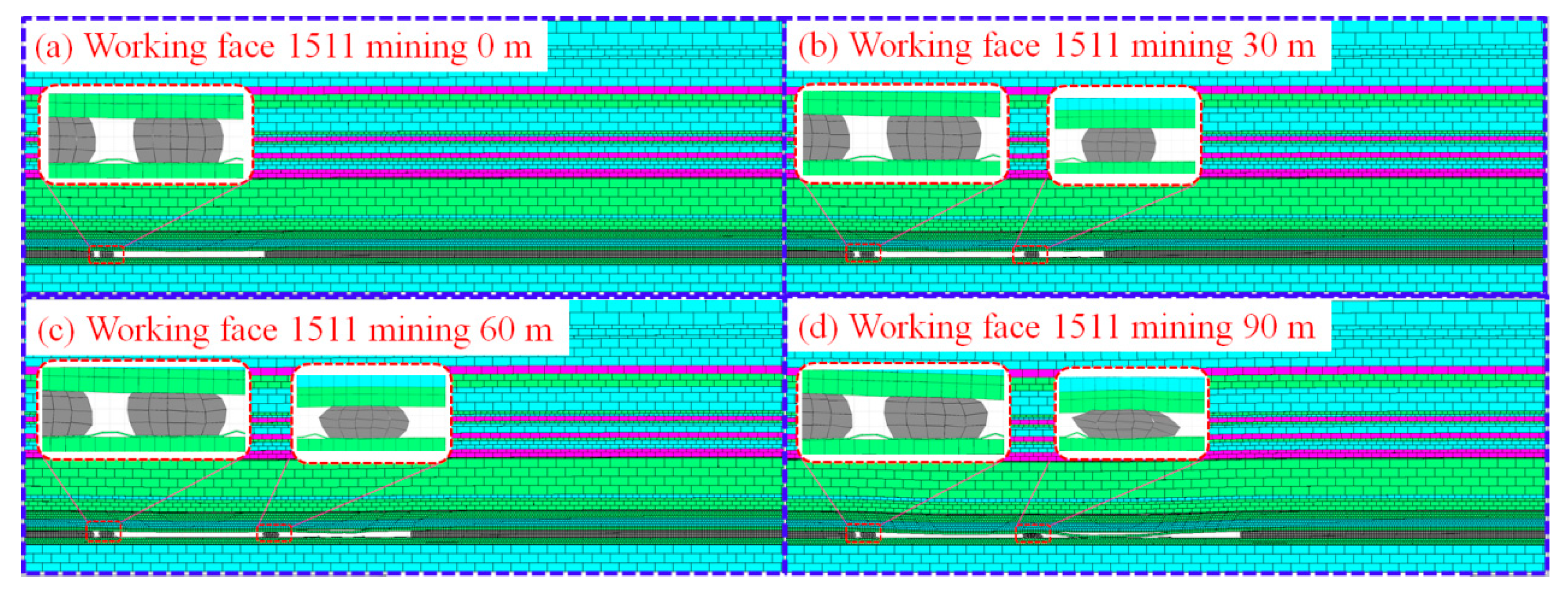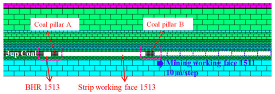 The numerical simulation procedure consists of four main steps: the (1) initial stress analysis of the undisturbed rock mass; (2) sequential extraction of the narrow panel 1513 followed by equilibrium computation; (3) development of the BHR 1513 while maintaining a 5 m protective coal pillar; and (4) incremental extraction of working face 1511 in 10 m intervals, preserving a 5 m pillar (Figure 5), to assess its impact on the adjacent BHR 1513 [21]. As working face 1511 advances rightward to the 90 m position, stress accumulation in coal pillar B triggers its failure. Consequently, the simulation terminates once panel 1511 reaches this critical advancement distance.