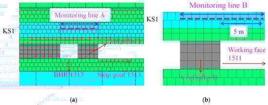 - For the comprehensive assessment of overburden behavior adjacent to BHR 1513, seven vertical displacement monitoring lines (designated as Line A) were installed—one for each key stratum (KS1–KS7). These measurement arrays spanned from the intact coal rib of BHR 1513 to the boundary of Coal Pillar A, with spatial distribution illustrated in Figure 6a (using KS1 as representative case);