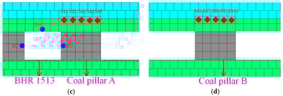 An identical configuration (M6–M10) installed at the same elevation above coal pillar B (Figure 6d) for comparative analysis.