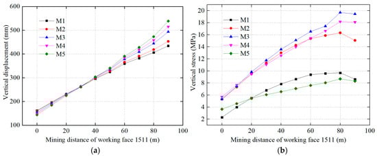 Vertical displacement and vertical stress of roof above coal pillar A with mining in working face 1511: (a) vertical displacement and (b) vertical stress.