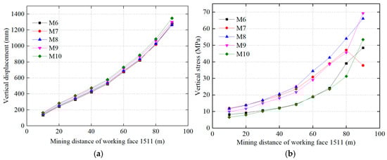 Vertical displacement and vertical stress of roof above coal pillar B with mining in working face 1511: (a) vertical displacement and (b) vertical stress.