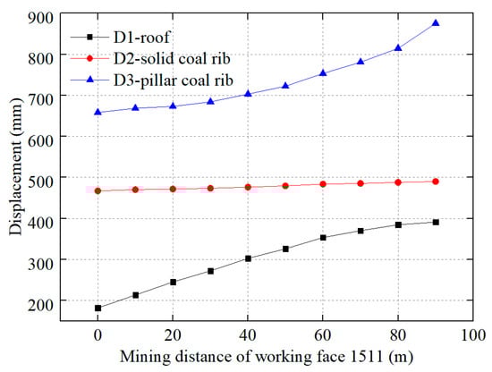 - When the mining distance of working face 1511 is within 60 m, the roof displacement shows a linear growth trend with a rapid growth rate, while the displacement of coal pillar sidewall grows slowly. When the mining distance of working face 1511 exceeds 60 m, the roof displacement velocity slows down, without obvious displacement, while the displacement velocity of the coal pillar sidewall increases significantly.
