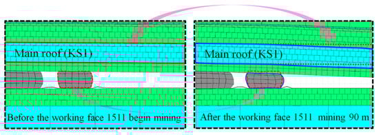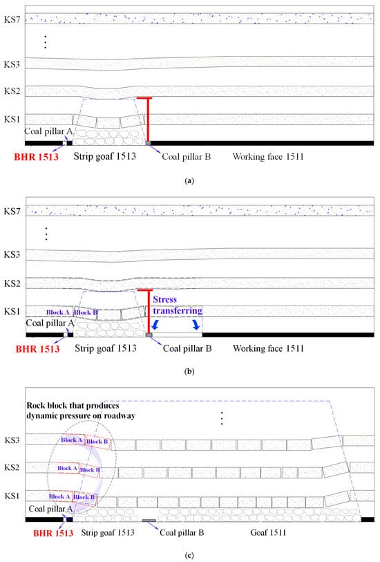 When the working face 1511 is gradually mined towards the right to 60–90 m, the compression and deformation of coal pillar B occur due to continuous pressure (Figure 13c,d), resulting in the penetration trend between strip goaf 1513 and goaf 1511, which forms a larger goaf. The overlying strata of goaf break up and collapse in turn, resulting in the breaking and rotation of the original unbroken high KS above strip goaf 1513, which forms dynamic block A and block B (Figure 12c). The broken block A and block B in KS1 above coal pillar A continued to rotate towards strip goaf 1513 under the breaking and rotating effect of high KS (Figure 14), making each KS in the lateral roof of BHR1513 begin to increase the rotation degree (Figure 7). Therefore, the vertical displacement of the 5 measuring points in the roof above coal pillar A begins to change (Figure 9a), showing a trend of rotation towards the strip goaf 1513. The further rotation and collapse of the broken block A and B in KS1 above coal pillar A towards the strip goaf 1513 will exert a disturbance effect on BHR 1513. The law of roadway surface displacement also reveals that when the mining distance of working face 1511 exceeds 60 m, the displacement velocity of the coal pillar sidewall begins to significantly accelerate (Figure 11), which is due to the overall displacement of the coal pillar sidewall towards the roadway space under the rotation of the broken rock in KS1 (Figure 14).