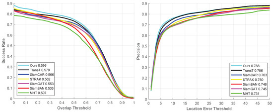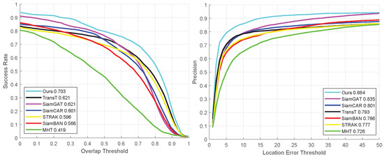 | Challenges | MHT | SiamBAN | SiamCAR | SiamGAT | STARK | TransT | Ours |