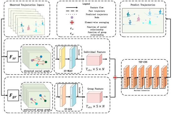 Among the GCN-based pedestrian trajectory prediction methods, Mohamed et al. [31] introduced Social-STGCNN, which utilized a spatial convolutional layer to model pedestrian social relationships and a temporal convolutional layer to capture long-term motion dependencies. Additionally, Youssef et al. [34] proposed the Spatio-Temporal Multi-Graph Convolutional Network (STM-GCN), which aggregated positional and velocity-based social interactions into multiple graphs, learning and predicting pedestrian trajectories via GNNs. Similarly, Sighencea et al. [35] developed the Interaction-Aware Spatio-Temporal Graph Neural Network (D-STCNN), which extracted features through a temporal graph network and incorporated spatial graph neural networks for interaction modeling.