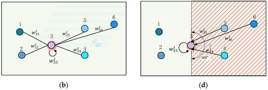 The construction of interaction graphs aims to incorporate these features while reflecting real-world interactions. Mainstream methods quantify interactions by considering the influence of all surrounding pedestrians and constructing undirected interaction graphs. The feature extraction process, as illustrated in Figure 2a,b, involves abstracting the six pedestrians into graph nodes and calculating the interaction features between these nodes. For example, in Figure 2b, each node (labeled 1–6) undergoes feature computation. Taking pedestrian 3 as an example, this pedestrian serves as the target node for feature aggregation, while pedestrians 1, 2, 4, 5, and 6 act as neighbor nodes providing interaction features. In the undirected graph construction shown in Figure 2b, node 3 considers the features of all the pedestrians in the scene.
