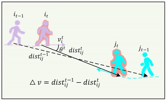 In Figure 3, we only calculate the influence of pedestrians in the positive direction of node i’s walking direction on . When considering the relative speed, , we divide the relationship into two cases: approaching and moving away. Since only approaching poses a collision risk, we only need to consider the influence when two pedestrians are approaching each other. If two people are walking towards each other or pedestrian is faster than pedestrian , then the relative speed obtained via is positive. The larger the value of , the larger the value of . In this case, the two will not pose a collision risk. If the two are moving away from each other, then is negative, and the influence of pedestrian on pedestrian is smaller at this time.
