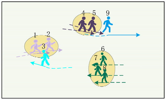 Our definition of groups is based on the behavioral logic of pedestrian groups. Groups in the crowd have similar ways of behaving. As a group of pedestrians, their direction of movement should be similar, the distance between pedestrians should be close, and their walking speed should be similar. Therefore, to determine whether pedestrians belong to the same group, these three conditions must be met simultaneously. As shown in Figure 4, pedestrian 3 is not in the same group as pedestrians 1 and 2 because the angle of their walking direction is too different, although pedestrian 3 is close to pedestrians 1 and 2. At the same time, pedestrian 9 is not in the same group as pedestrians 4 and 5 because their speed difference is too large, although the distance between pedestrian 9 and pedestrians 4 and 5 is close and the angle of their walking direction is also close. The changes of groups are particularly evident in the temporal dimension, so we make group determinations for the crowd at each time step and encode them into the adjacency matrix for propagation in the model. In the function we designed, thresholds are used to judge the direction of travel, the distance between pedestrians, and the speed of pedestrians to divide the groups. We compare each pedestrian in the crowd one by one, taking pedestrians and as an example for group determination.