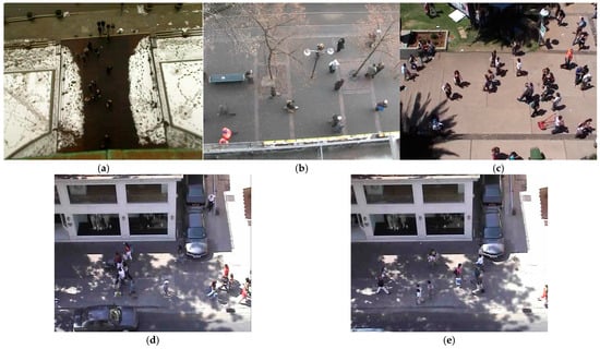 Frame examples from the five subsets of the ETH and UCY datasets. (a) Campus environment; (b) hotel surroundings; (c) university campus; (d) mall plaza; (e) mall plaza.