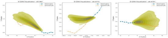Through the probability density visualization in Figure 6, it is evident that the DSGAT model proposed in this study exhibits significant advantages in estimating the trajectory probability distributions. Its generated trajectories accurately capture the overall movement trends of pedestrians. This advantage primarily stems from the model’s effective integration of multidimensional pedestrian interaction information, including spatial relative positions, movement velocities, directions, and group characteristics, enabling the precise modeling of the trajectory probability distributions.