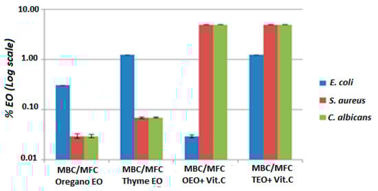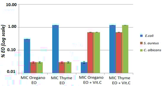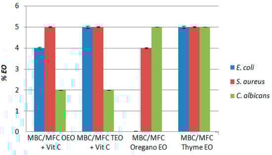 Similar to the oregano combination, the thyme essential oil (TEO) combined with vitamin C also antimicrobial activity. The MIC values of the combination were below 0.035% (v/v) for all tested strains. For comparison, pure TEO exhibited MIC values of 1.25% for E. coli, 0.62% for S. aureus and 1.25% for C. albicans. The MBC/MFC values of the TEO + vitamin C combination were <0.035% for E. coli and 0.07% for S. aureus and C. albicans. In contrast, the MBC for pure TEO was 1.25% for E. coli and exceeded 5% for S. aureus and C. albicans. Table 2 presents the results of MIC and MBC/MFC of combinations oregano EO–vitamin C and thyme EO–vitamin C against E. coli, S. aureus and C. albicans.
