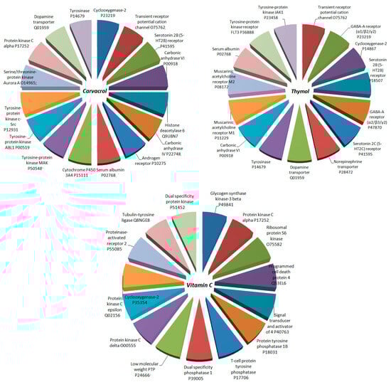 To complement the in vitro findings, an in silico analysis was conducted to predict potential interactions between carvacrol, thymol and vitamin C and human proteins. The SwissTargetPrediction platform [28] was used to identify the 15 most probable targets for each compound, based on structural similarity and probability scores derived from the UniProtKB/Swiss-Prot database [29]. The predicted targets and their corresponding UniProt identifiers are shown in Figure 4.
