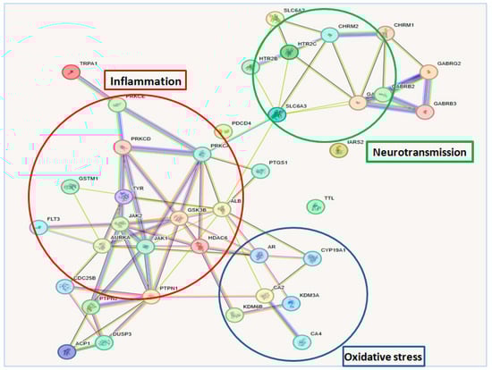 Protein–protein interaction (PPI) network of predicted human targets of carvacrol, thymoland vitamin C, generated using STRING v11.5 [30]. Nodes represent proteins; edges indicate predicted functional associations. Line colors reflect the source of interaction evidence: pink (experiments), blue (databases), green (neighborhood), black (co-expression), yellow (text mining) and light blue (co-occurrence). The three functional clusters—inflammation (red circle), neurotransmission (green circle) and oxidative stress (blue circle)—are labeled based on biological roles of the included proteins. Key nodes such as JAK1, STAT3and GSK3B appear centrally within the inflammatory cluster.