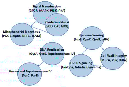 Functional clustering of predicted molecular targets modulated by carvacrol, thymol and vitamin C. Each node represents a biological process, with key proteins or genes indicated in parentheses. Lines denote functional associations. The clusters highlight processes relevant to antimicrobial action and host modulation, including oxidative stress, signal transduction, mitochondrial biogenesis, DNA replication, quorum sensing and cell wall integrity.