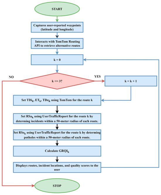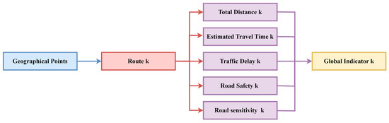 Figure 1 presents the overall diagram of GRQIk. The user provides the geographical points. For each alternative route generated by the TomTom API concerning the geographical points provided by the user, a wealth of data was retrieved to facilitate comprehensive route analysis. The primary data points include: