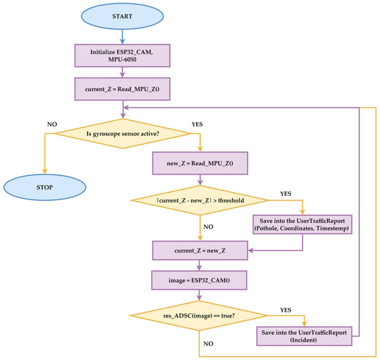The flowchart presented in Figure 2 contains the operational workflow for ADSC and the Pothole Procedure Component (PP). It outlines the process for detecting road hazards, such as potholes, accidents, and violence, using an ESP32-CAM module (manufactured by Espressif Systems Co., Ltd., Shanghai, China) and an MPU-6050 gyroscope (produced by TDK InvenSense, Shenzhen, China). Potholes are identified through the MPU-6050 gyroscope, which measures angular velocity along the Z-axis. When the difference between consecutive readings exceeds a predefined threshold (e.g., 0.8 rad/s), it indicates a road irregularity, and the system logs the event as a pothole in the “UserTrafficReport” table, including GPS coordinates and timestamps. The pothole identification system is based on variations between the positions of the device at two consecutive points. A pothole is identified at the corresponding geographical coordinates if the variation exceeds an empirically imposed threshold.
