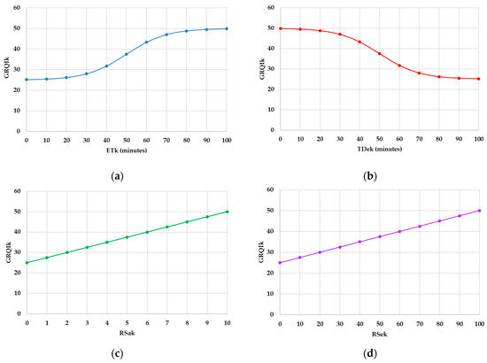 The GRQIk is calculated for route k using Equation (1). It incorporates TDik, ETk, TDek, RSak, and RSek to compare the value between routes, helping users assess the best one.