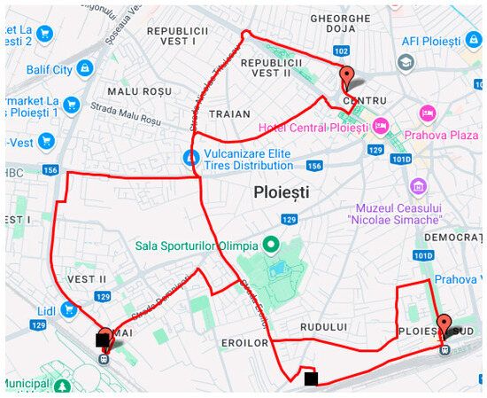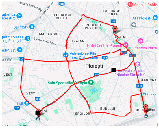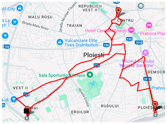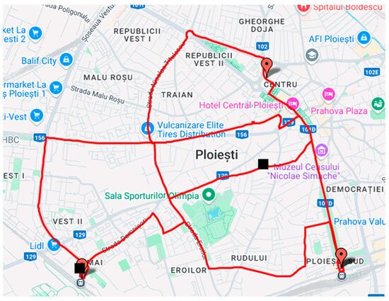 In this study, the TomTom Routing API was instrumental in obtaining alternative routes between user-specified waypoints. The system could assess and compare multiple route options by leveraging the API’s ability to deliver detailed route metrics and real-time traffic data. The API request was constructed to retrieve the three alternative routes [68]. The TomTom request provided the TDik, ETk, and TDek parameters.