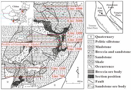 Based on existing geological data and previous research, our research group conducted an in-depth study on the geological model of the Jinding lead–zinc deposit and proposed a two-dimensional geological model of the deposit[], as shown in Figure 2.