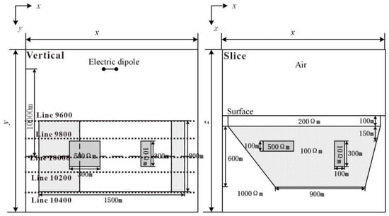 Therefore, based on the 2D geological model that uses the electrical parameters of rocks in the Jinding lead–zinc deposit (Table 1), a 3D geophysical model is constructed, as shown in Figure 3. In the figure, the first layer represents the surface covering layer with a thickness of 100 m. Its main component is sand and gravel strata, and it has an average resistivity of 200 . Beneath the covering layer lie domes and concealed deep fault structures with a resistivity of 100 . On both sides of the fault are high-resistance surrounding rocks with a resistivity of 1000 . The ore bodies are hosted within the dome structure, primarily consisting of sandstone-type and limestone breccia ore bodies. The sandstone ore body resembles a platy form, with a resistivity of 500 . Its dimensions are 300 m in length, 100 m in width, and 300 m in height. The limestone breccia ore bodies often appear as inclined or vertical thin layers, also with a resistivity of 500 , and their dimensions are 100 m in length, 300 m in width, and 300 m in height. The limestone breccia ore bodies often occur as inclined or vertical thin layers with a resistivity of 500 . Their dimensions are typically 100 m in length, 300 m in width, and 300 m in height.