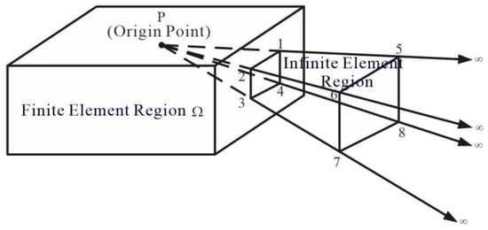 The coupled finite element–infinite element method divides the entire solution domain into a finite element region and an infinite element region, replacing the traditional outer boundary with the infinite element region. Finite element analysis and infinite element analysis are performed in the two regions, respectively, and they are combined through the assembly of the overall stiffness matrix to obtain the numerical solution.