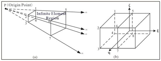 When performing infinite element analysis, a three-dimensional eight-node Astley-type infinite element is used [29]. Figure 6 presents a schematic diagram of three-dimensional infinite element mapping, where nodes 1, 2, 3, 4, 5, 6, 7, and 8 are the basic elements of the infinite element. P is the coordinate origin, and nodes 1, 2, 3, and 4 are the four nodes of a finite element on the boundary. The distances from point P to nodes 5, 6, 7, and 8 are twice the distances from point P to nodes 1, 2, 3, and 4, respectively. Infinite element analysis involves mapping infinite coordinates to the local coordinates in Figure 6b through infinite element mapping. In Figure 6b, the four outermost nodes of the infinite element represent infinity, and their field values are zero.