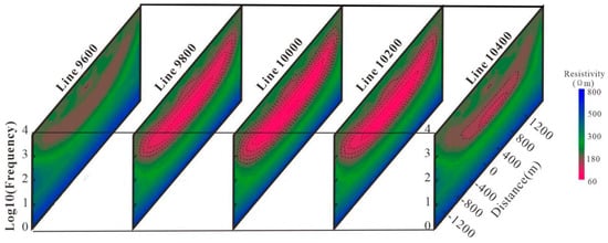 The numerical simulation results are presented in Figure 7. In Figure, from left to right, the vertical source–receiver distances of the five survey lines are 9600 m, 9800 m, 10,000 m, 10,200 m, and 10,400 m, respectively (Figure 3). From the apparent resistivity pseudo-section map, it can be observed that the CSAMT 3D forward modeling results exhibit a significant response to the low-resistivity dome structure of the Jinding lead–zinc deposit, providing a clear reflection of the structure’s morphology. However, due to the boundary effects, the boundary between the dome structure and the high-resistivity limestone is relatively blurred. In addition, due to the low-resistivity shielding effect of electromagnetic methods, the relatively high-resistivity lead–zinc ore bodies show little response in the simulation. Based on the numerical simulation results, it can be seen that when exploring high-resistivity target bodies in low-resistivity surrounding rocks, the CSAMT electromagnetic response is weak, and the numerical effect is not significant. However, when exploring low-resistivity structures such as faults and fracture zones in high-resistivity surrounding rocks, the effect is very pronounced. Therefore, it is feasible to conduct CSAMT exploration research in the Jinding lead–zinc mining area to identify low-resistivity faults, dome structures, and other features within the ore deposit.