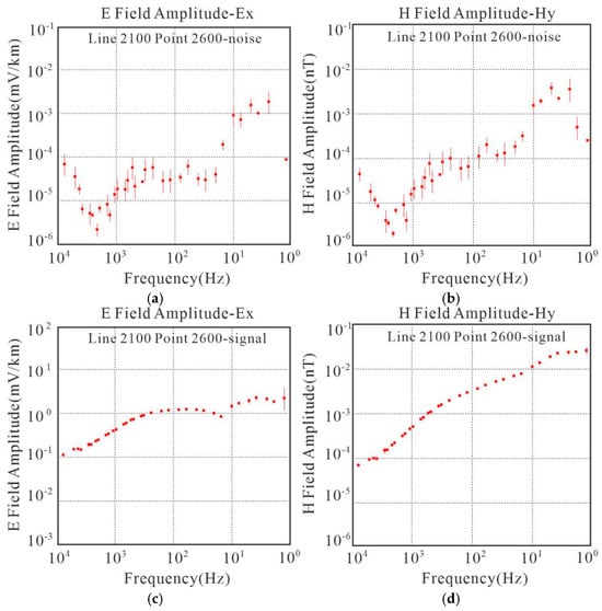 Comparison of the amplitude between the noise and total signals at the test point. (a) Amplitude of the noise signal in E; (b) amplitude of the noise signal in H; (c) amplitude of the total signal in E; (d) amplitude of the total signal in H.