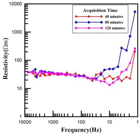 Experimental conditions: With a single acquisition cycle of 40 min, three acquisition times of 40, 80, and 120 min were selected. Under the same survey line, survey point, equipment, and field source, three apparent resistivity sounding curves were obtained. The experimental results for the different acquisition times are shown in Figure 9.